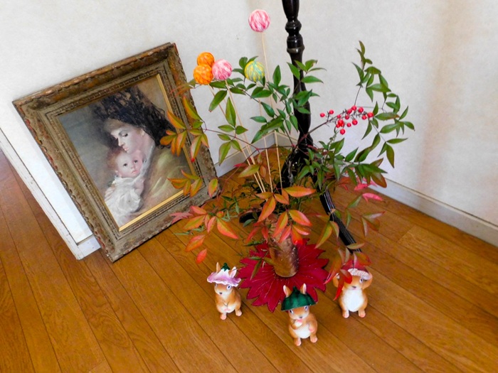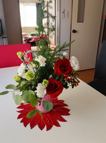 作品展で「いいなぁ」と思った生け花。聞けば、嵯峨御流というのだそう。草月の水盤と違っていて生けやすさと我が家のさもない花でも素敵な形が出来上がって行く。先生の人柄や月謝、花代の安さに10月から始めたのに不調で休んでいた。12月9日は、クリスマス用にアレンジ。私はキッチンに置く為何処から見ても素敵な風に!!考えすぎて手直して貰った。 |