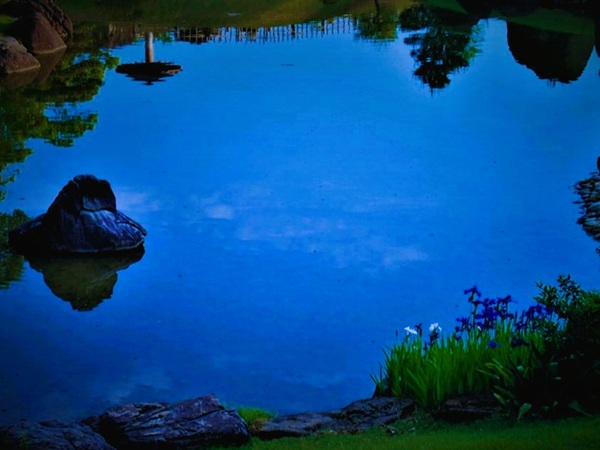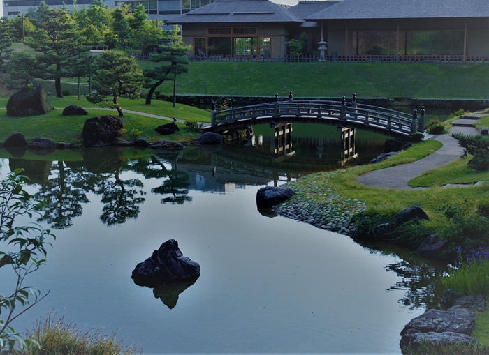 大きな池に大小3つの中島を浮かべ、周囲を遠路で結ぶ
