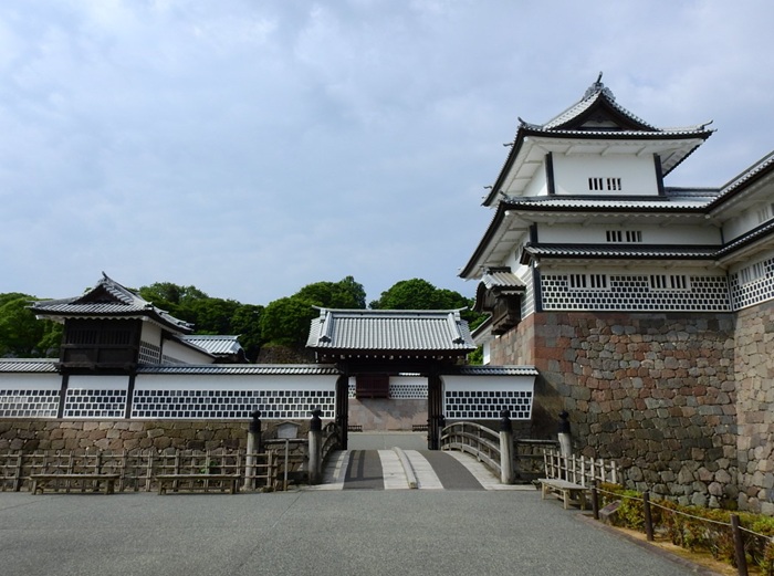 金沢城の搦手(裏口)門で、高麗門の一の門、櫓門の二の門、続櫓と